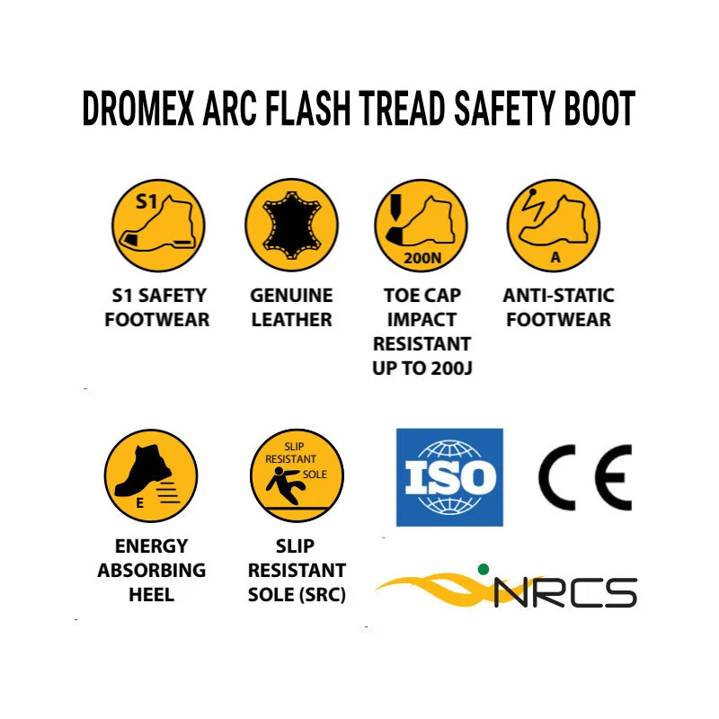 The Dromex Flash Tread (also known as Arc Flash Tread Safety Boot) is a lightweight, non-metallic ankle-height safety boot designed for high-risk environments involving electric arc flash, flash fire, contact heat, and general industrial hazards.