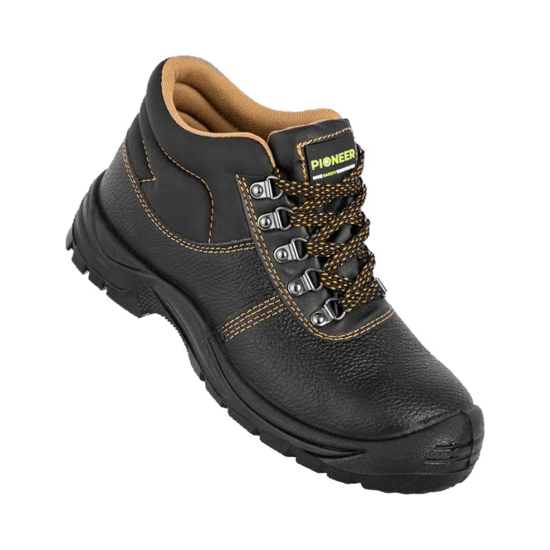 The Pioneer PNBT is a rugged, entry-level lace-up ankle safety boot in black, popular in South Africa for construction, manufacturing, mining, warehousing, and general industrial work. It offers solid mechanical protection with a steel toe cap and midsole at a budget price, featuring a durable synthetic leather upper and comfortable padded elements for all-day wear.